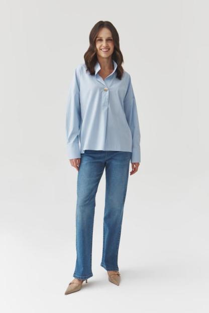 Oversizowa bluzka damska ze stójką zapinaną na ozdobny guzik z przodu. Długie rękawy wykończono szerokimi mankietami z guzikiem. Przewaga bawełny w składzie sprawia, że tkanina jest przewiewna. Proste cięcie u dołu bluzki nadaje jej nowoczesnego charakteru. Model sprawdzi się w stylizacjach do biura i na specjalne okazje. Dostępny w dwóch pastelowych kolorach. Długość: Klasyczna Fason: Oversize Dekolt: Stójka Rękawy: Długie Mankiety: Szerokie z guzikami Zapięcie: Guzik z przodu Wzór: Gładka Polecane: Na spotkanie, do biura, na specjalne okazje Wzrost modelki: 174 cm Prezentowany rozmiar ubrania:36/SProducent KAN Sp. z o.o.