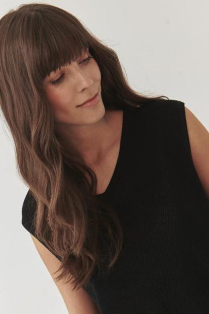 Przewiewna i szlachetna w wyglądzie dzianinowa bluzka damska bez rękawów, która świetnie sprawdzi się do codziennych stylizacji, w szczególności latem i w okresie przejściowym. Wyróżnia ją ozdobna jodełkowa struktura na przodzie. Model dostępny w dwóch wersjach kolorystycznych. Długość: regularna Fason: bezrękawnik Rękawy: nie Wzór: gładka, strukturalna Dekolt: w kształcie „V” Polecamy: na wiosnę, lato i jesień Wzrost modelki: 176 cm Prezentowany rozmiar ubrania: S/36 Producent KAN Sp. z o.o.