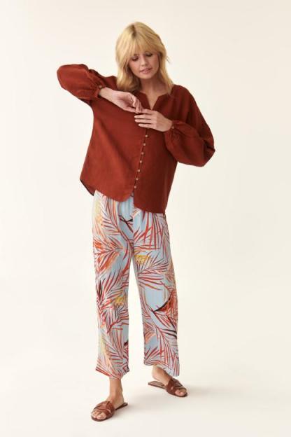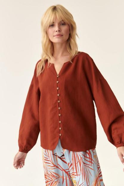 Koszula damska o nieco luźniejszym kroju, w składzie przeważa len. Dekolt w delikatną łódkę z pęknięciem na środku. Bluzka zapinana jest na kokosowe guziczki. Z przodu podkrój dołu łukowaty, tył dłuższy. Ciekawy długi rękaw, o opuszczonej linii ramienia, wykończony pliską, marszczony w dole, zapinany na guzik. Dostępna w dwóch ciepłych odcieniach pomarańczu i brązu.Długość: klasycznaFason: oversize, luźniejszy Rękaw: długiWzór: gładka Polecane: na spotkanie, na co dzień, wiosnę i lato Wzrost modelki: 178 cmPrezentowany rozmiar ubrania: 38/M Producent KAN Sp. z o.o.