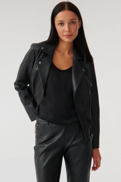 Żakiet damski typu ramoneska wykonany z dzianiny imitującej skórę. Zapinany z przodu na ukośny metalowy zamek. Z przodu posiada praktyczne kieszenie. Żakiet jest taliowany, pięknie podkreślając kształty. Dzięki tkaninowej podszewce model ten sprawdzi się w chłodniejsze dni. Idealne okrycie wierzchnie na okres przejściowy oraz na letnie wieczory. Długość: klasyczna Fason: dopasowany Rękawy: długie Dekolt: klapy Zapięcie: zamek błyskawiczny Kieszenie: dwie z przodu Podszewka: tak Polecany: na co dzień, na wiosnę, lato i jesień Wzrost modelki: 178 cm Prezentowany rozmiar ubrania: S/36 Producent KAN Sp. z o.o.