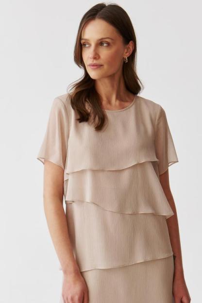 Niezwykła warstwowa sukienka wykonana z połyskującego, półtransparentnego szyfonu i delikatnej, wiskozowej podszewki. Model polecany na specjalne okazje, takie jak przyjęcia, imprezy i uroczystości, szczególnie w sezonie wiosenno – letnim. Długość: w kolano Dekolt: okrągły Rękawy: krótkie Kieszenie: nie Zapięcie: nie Podszewka: tak Wzór: gładka Polecana: na specjalne okazje, przyjęcia i uroczystości, na wiosnę i lato Wzrost modelki: 174 cm Prezentowany rozmiar ubrania: 36/S Producent KAN Sp. z o.o.
