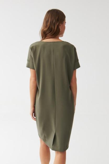 Sukienka o formie beczki z krótkim kimonowym rękawem i okrągłym dekoltem z pęknięciem w kształcie litery „V”, które optycznie wysmukla sylwetkę. Sukienka wyposażona jest w wygodne kieszenie, ukryte w szwach bocznych. Rozporek z tyłu zapewnia swobodę ruchów. Model ten świetnie sprawdzi się w codziennych stylizacjach, na spotkania, a także do biura. Długość: w kolano Fason: beczka Rękaw: krótkie Mankiety: ściągacz Dekolt: okrągły z pęknięciem w kształcie „V” Wzór: gładka Polecamy: do biura, na spotkania, na co dzień Wzrost modelki: 178 cm Prezentowany rozmiar ubrania: 36/S Producent KAN Sp. z o.o.