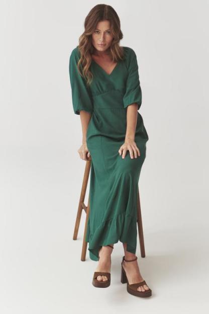 Tkaninowa maxi sukienka z dekoracyjną falbanką u dołu i lekko bufiastymi rękawami. Wykonana w 100 % z wysokiej jakości wiskozy – niezwykle przewiewnej, przyjemnej w dotyku i korzystnie układającej się na sylwetce. Model doskonale sprawdzi się wiosną, latem i wczesną jesienią. Fason: z falbanką Długość: maxi Dekolt: w kształcie „V” Rękawy: do łokcia Kieszenie: nie Zapięcie: zamek kryty z boku Wzór: gładka Polecana: na wiosnę, lato i wczesną jesień, na wakacje, spotkania ze znajomymi, wyjścia na miasto, przyjęcia Wzrost modelki: 177 cm Prezentowany rozmiar ubrania: S/36 Producent KAN Sp. z o.o.