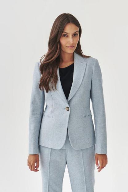 Klasyczny żakiet z klapami o lekko taliowanym kroju, z praktycznym zapięciem na guzik. Wzór w jodełkę idealnie wpisuje się w jesienny charakter kolekcji, a przewaga wełny w składzie tkaniny zasadniczej zapewnia ciepło. Żakiet świetnie współgra ze spodniami SUMKO, tworząc biurową stylizację. Sprawdzi się również w codziennych, casualowych zestawieniach. Model jest dostępny w dwóch wariantach kolorystycznych. Fason: Klasyczny, z taliowaniem Rękaw: Długi Kołnierz: Klapy Podszewka: Tak Długość: Standard Polecamy: Do biura, do codziennych stylizacji Wzrost modelki: 171 cm Prezentowany rozmiar ubrania: 36/S Producent KAN Sp. z o.o.